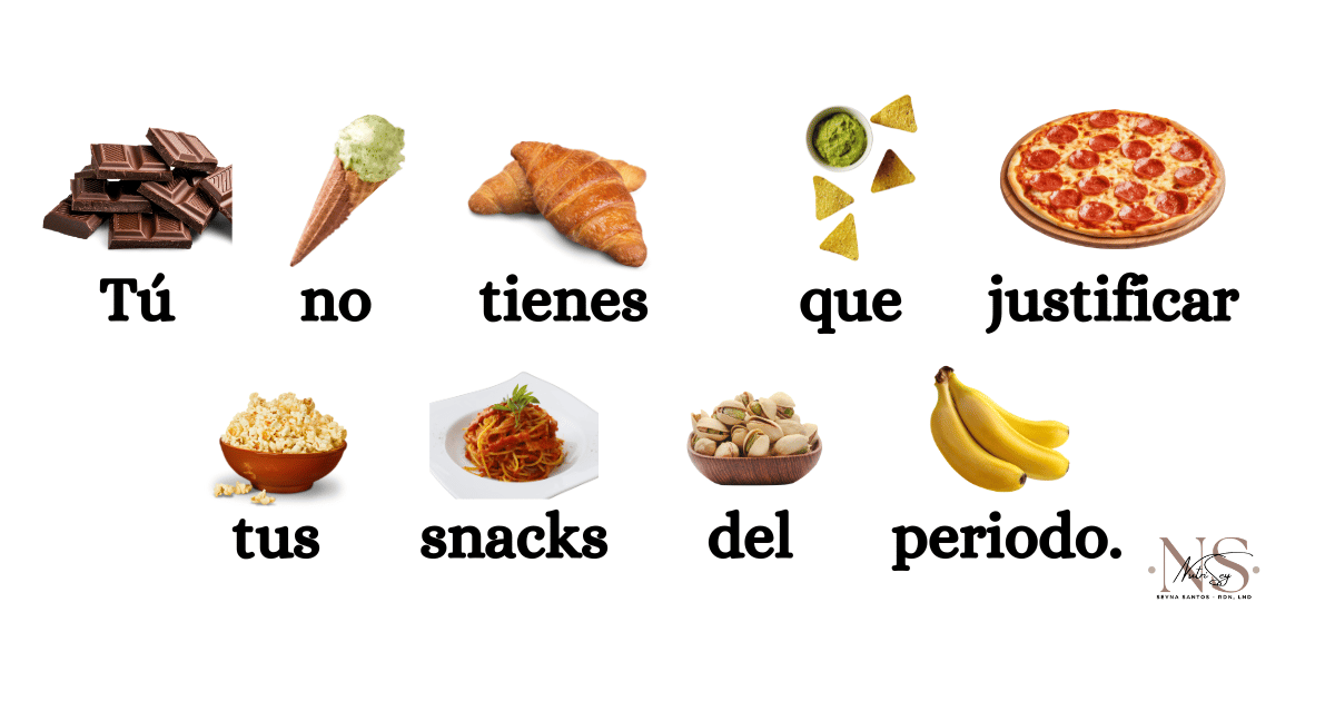Recuerda ser gentil contigo: no dejes que tus elecciones alimentarias te hagan sentir culpable o mal contigo misma. Si los pastries o 5 pedazos de pizza son lo que te brinda confort durante esta época del mes, permítete ese treat, se autocompasiva. Tu útero está sangrando y es una experiencia fuerte y desagradable. Para algunas, puede ser doloroso y debilitante. Escucha a tu cuerpo, descansa, disfruta de tus comidas favoritas y cuídalo como creas conveniente. Nadie conoce tú cuerpo mejor que tú misma.
